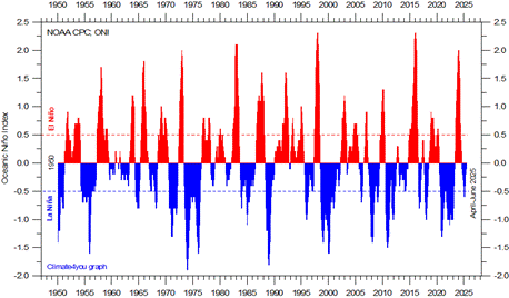 Mit El Niño (spanisch für das Christkind, weil der Effekt um Weihnachten am stärksten ist) bezeichnet man das Phänomen der Windumkehr im zentralen äquatorialen Pazifik, das den Aufstieg kalten Tiefenwassers vor Südamerika unterbindet und deshalb die Temperaturen dort stark anhebt – mit globalen Auswirkungen. Der gegenteilige Effekt wird mit La Niña bezeichnet und zusammen bilden sie die Südliche Oszillation ENSO. Rote Bereiche bedeuten höhere Meerestemperaturen als im Mittel (Grafik von https://www.climate4you.com/SeaTemperatures.htm): Die starken El Niños von 1997/98, 2015/16 und 2023/24 findet man in der globalen Temperaturkurve als starke Temperaturerhöhungen wieder. Im Juli 2025 war ENSO im neutralen Stadium und die globale Temperatur fiel auf das Niveau vom Juli 1998.