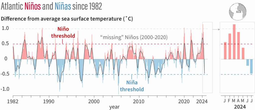 Im Atlantik gibt es ein ähnliches Phänomen wie im Pazifik. Die üblichen Passastwinde aus östlicher Richtung werden in unregelmäßigen Abständen abgeschwächt oder sogar durch Westwinde ersetzt. Diese verhindern auch hier den Aufstieg kalten Tiefenwassers, diesmal vor der äquatorialen Westküste Afrikas. Der Atlantische Niño von 2024 war der stärkste, seit es Aufzeichnungen gibt (seit 1982, rechts der Ausschnitt Januar bis Juli 24, von https://www.climate.gov/media/16295). Das Maximum war im März 2024. Er hat, ähnlich wie 1998, den globalen Effekt des pazifischen El Niño verstärkt und hat die hohen Temperaturen um einige Monate verlängert.