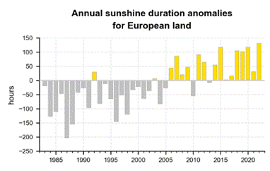 Seit Mitte der 1980er Jahre geht die Bewölkung global zurück. Parallel dazu nahm die Zahl der Sonnenstunden zu, in Europa um mehr als 200 Stunden pro Jahr, wie die Auswertung (links) des Copernicus-Service der EU zeigt (https://climate.copernicus.eu/esotc/2022/clouds-and-sunshine-duration). Der globale Rückgang der Bewölkung und ihre Folgen wurde in vielen Veröffentlichungen dokumentiert, u. a. In dieser: https://www.mdpi.com/2673-7418/4/3/17#.