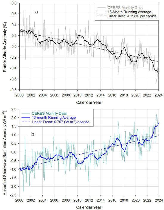 Sie zeigt im Teil a von Abbildung 1 (links) die Veränderung der globalen Reflexion der Sonnenstrahlung seit dem Jahr 2000, mit deutlich abnehmendem Trend aufgrund des Rückgangs der Bewölkung, der unter anderem wegen Luftreinhaltungsmaßnahmen, seit 2020 vor allem wegen saubereren Schiffsdiesels, erfolgte. In Teil b ist die von der Erdoberfläche absorbierte Sonnenstrahlung dargestellt, die insbesondere in den Jahren 2023 und 2024 stark zugenommen hat.