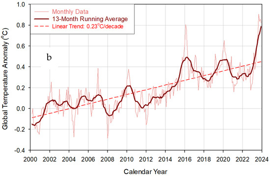 Die dritte Grafik, aus Abbildung 5 der zitierten Veröffentlichung, zeigt die globale Temperaturentwicklung im gleichen Zeitraum als Mittelwert von 6 verschiedenen Auswertungen. Die Übereinstimmung mit obiger Kurve ist sehr gut. Abweichungen ergeben sich in erster Linie durch ENSO-Ereignisse (z. B. La Niña in 2000, 2008 und 2012, El Niño in 2010, 2016 and 2024) und den Atlantischen Niño.