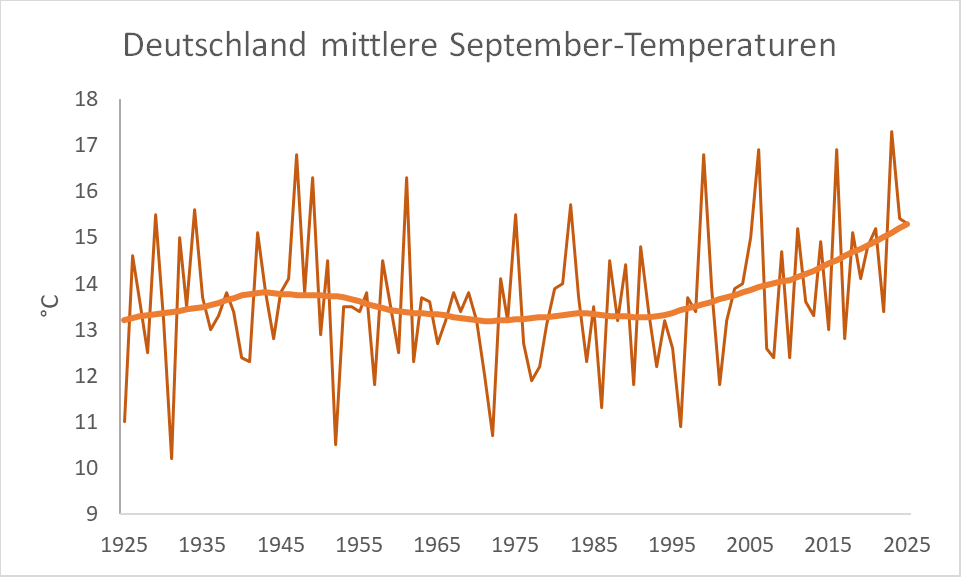 Die 15,3 °C an sich sind überhaupt nicht außergewöhnlich: Es gab 12 September in Vorjahren, die wärmer waren, davon 6 bis 1980. Den Vogel schoss 2023 ab, dieser Rekord steht bei 17,3°C. Der aktuelle Wert von 2025 war ganze 2 Grad kühler und gehört dennoch zu den “oberen 88%”. Erst ein 30-ähriger Tiefpass (ähnlich wie ihn der DWD seit einigen Monaten auch anwendet) macht die Entwicklung deutlich. Sein höchster Wert vor 1980 betrug 13,8°C (1943), gegenwärtig steht er bei 15,3°C. Daher trägt die Klimaentwicklung nach 1980 nun garantiert 1,5°C zu den Temperaturen bei. Der Trend ist eindeutig.