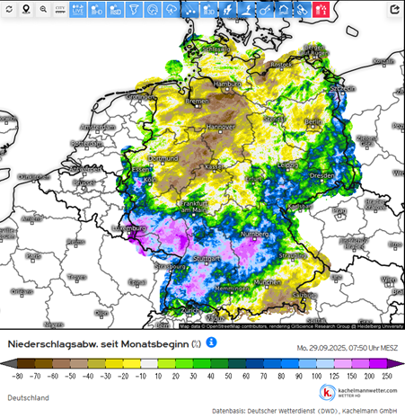Die Regenmengen waren im September 2025 beachtlich, nur 6 Jahre der letzte 100 wiesen nassere September auf, davon 3 vor 1980.