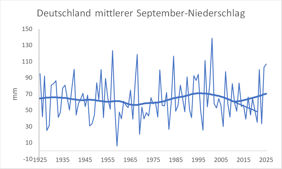 Das liegt daran, dass die Methode dieses 30-jährigen Tiefpasses die Ergebnisse für die letzten 15 Jahre nur schätzen kann, es gibt ja noch keine echten Werte danach. Der Verlauf an Anfang und Ende der Periode ist daher nur eine Schätzung, einige neue Folgejahre können die sehr stark beeinflussen. Die Jahre 2022, 2024 und 2025 waren sehr niederschlagsreich im September und schon wird aus dem vermeintlichen kontinuierlichen Trend-Abstieg am Ende ein auch vermeintlicher Anstieg. Beides ist nicht gesichert! Die auch vom DWD so benutzte Loess – Glättung ist zu Beginn (das wurde hier vermieden, da es real Daten bis zurück zu 1881 gibt) und zum Ende hin stark fehlerbehaftet. Gerade da ist es jedoch meist am interessantesten. Man muss das beachten, um manche Meldung besser einordnen zu können.