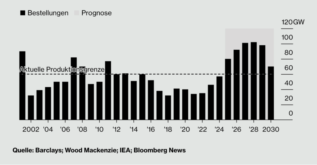Bloomberg kommt in seiner Analyse zu dem Schluss, dass die weltweiten Kapazitäten bei der Produktion von Turbinen nicht ausreicht, um den Bedarf zu decken.