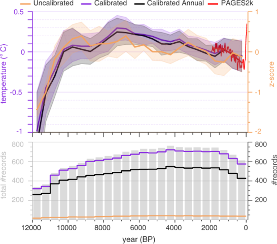 Besonders interessant: Seit 5000 Jahren sei die globale Temperatur auf 1-2 zehntel Grad gleich, so Rahmstorf unter Verweis auf Proxy-Daten. Schon vor dem Schreiben des Buchkapitels gab es ganz andere Ergebnisse der Forschung zum Thema. So erschien 2020 eine Arbeit mit diesem Ergebnis: