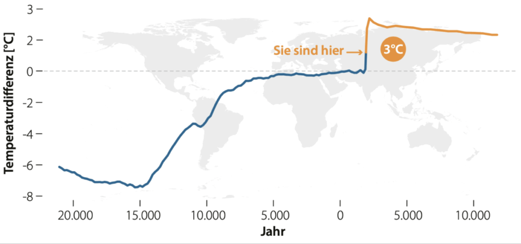 Die 3 Grad mehr, das ist die Botschaft, alles im Buch ist auf dieses Szenario ausgerichtet mit dystopischen Beschreibungen einer zukünftigen Welt mit diesen Temperaturen. Das frei lesbare Kapitel von Stefan Rahmstorf beginnt denn auch, das in einen Paleo-klimatischen Zusammenhang zu setzen mit dieser Abbildung: