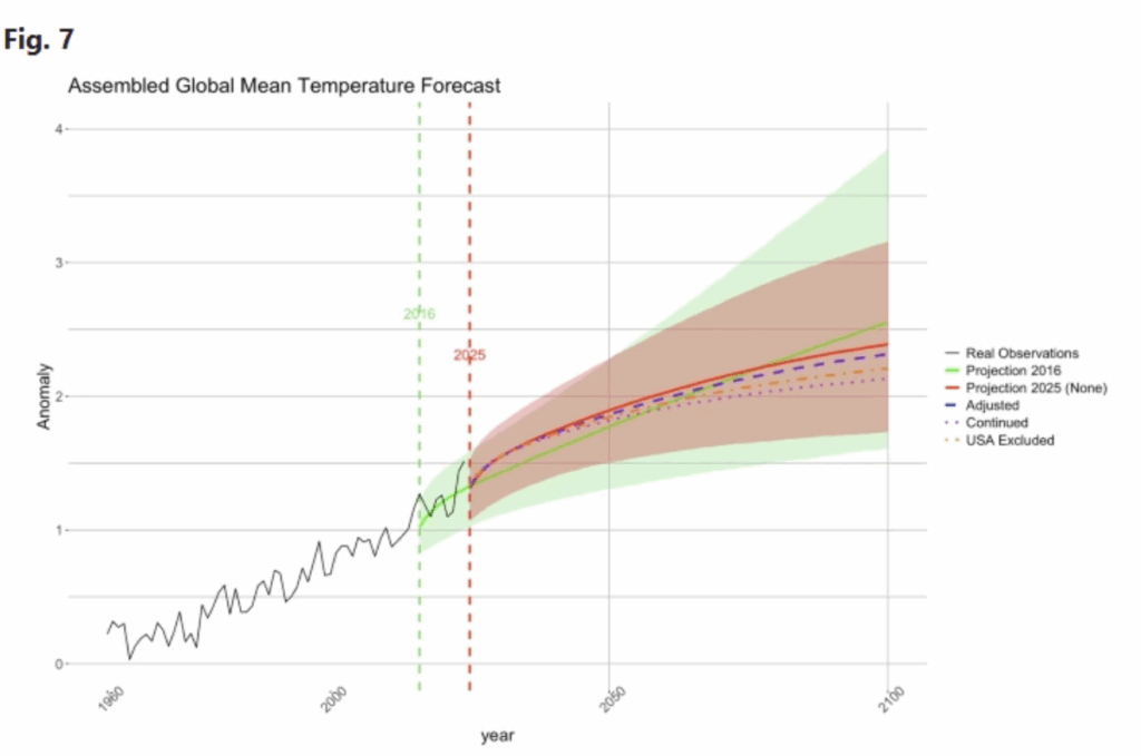 Links der rot gestrichelten Linie die 2025 markiert, finden sich die beobachteten Temperaturen bis 2024, rechts davon die Erwartungen mit dem „Wahrscheinlich-Bereich“ in grün für eine vorangegangene Schätzung aus 2016, in Rot die aktuelle Projektion. Was sofort auffällt, ist die starke Reduktion des Bereichs am oberen Ende.