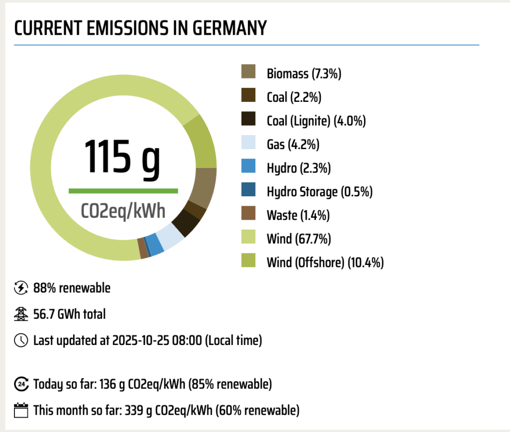 Gerade zu Anfang 2025 lagen die ersten 4 Monate deutlich über dem Vorjahr. Erst ab Mai sanken die Werte. Jetzt im Herbst steigen sie wieder, was der These widerspricht, dass Solar und Wind sich optimal ergänzen. Offenbar nicht. Nach den Nowtricity-Zahlen lagen die ersten 9 Monate in Deutschland demnach bei 376 g/kWh.