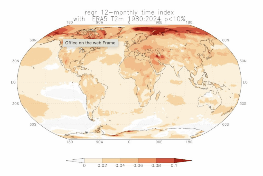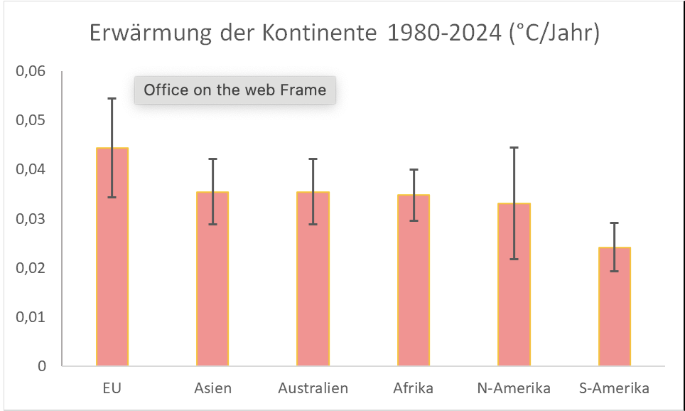 Mit genau den angesprochenen Daten (ERA5) lassen sich die kontinentalen Erwärmungsraten zwischen 1980 und 2024 (bis auf Antarktika) bestimmen und das ergibt dieses Bild: