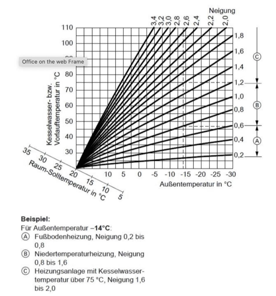 Schon können Sie im “Viessmann Diagramm” die Neigung bestimmen und dann schauen, wo Sie bei der Vorlauftemperatur im Winter landen. Dann im ersten Diagramm den erwarteten COP einer Wärmepumpe bestimmen.