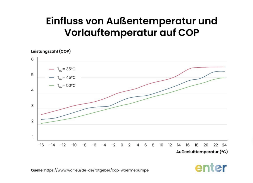 Dort ist ein zweiter Parameter berücksichtigt: Die Temperaturdifferenz zwischen Außenluft und der Temperatur des Wassers in der Heizung selbst, die notwendige Vorlauftemperatur. Je größer die ist, desto mehr Arbeit zum Verdichten muss mit Strom verrichtet werden. Erhebt sich sofort die nächste Frage: Welche Vorlauftemperatur ist erforderlich? Beträgt die -3°C und es ist eine Vorlauftemperatur der Heizung von 50°C erforderlich, liest man einen COP von ca. 3 ab, bei einer „Niedertemperatur-Heizung“, realisiert dann als Fußbodenheizung, ist er deutlich höher: ca. 3,7. Bei einer im Winter nicht unüblichen Außentemperatur von -10° in der Nacht schnurrt der COP auf ca. 2,5 zusammen, wenn der Vorlauf 50°C erfordert, bei 35°C sind er noch deutlich über drei.