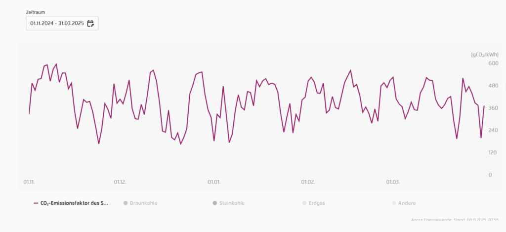 “Immerhin” werden Sie einwenden: Das ist ja noch immer ganz gut, man benötigt nur die Hälfte der Energie aus Elektrizität gegenüber einer rein elektrischen Heizung. Nur ist das eher nicht üblich, Erdgas ist in den allermeisten Gebäuden der Konkurrent. Wie sieht es mit dem CO2-Ausstoß im Vergleich zu unserem Strom aus? Erdgas kommt auf ca. 210 g CO2/kWh, sagt einer der „Ober-Energiewender“, Prof. Quaschning. Wie ist das mit unserem Strommix? Ein Blick auf die letzte Heizsaison: