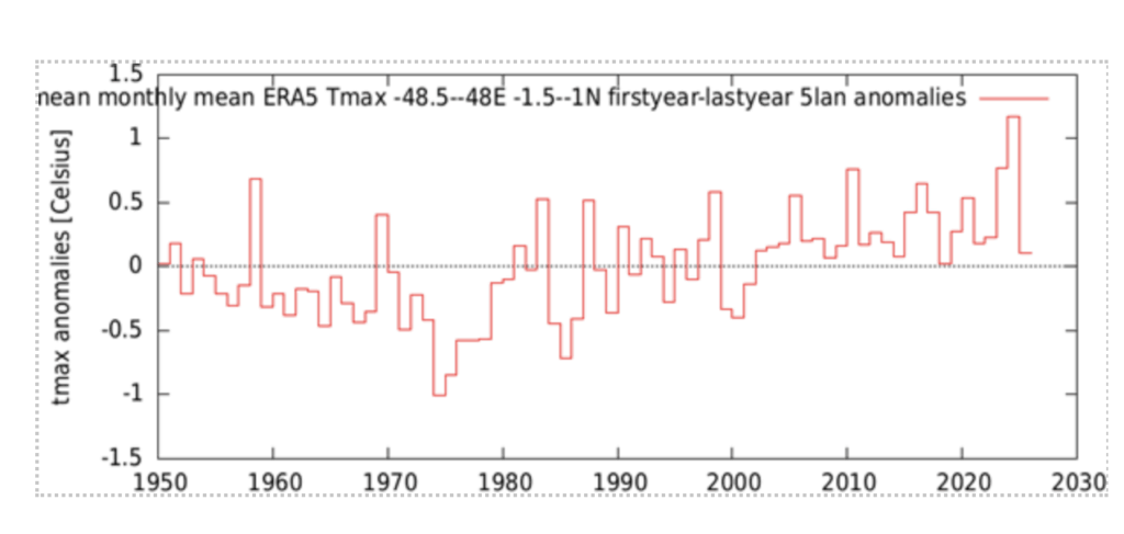 Es ist zwar um ca. 0,8 °C wärmer geworden seit Beginn der 80er Jahre, weiter zurück bis 1950 jedoch auch um etwa 0,5°C. Im Mittel sehen wir bei den Tmax (ERHITZUNG!) ca. 0,4 °C mehr als damals, nur ist da auch sehr viel Variabilität. Das ist kein Wunder, hatten wir doch bereits hier herausgefunden, dass sich Südamerika mit Brasilien signifikant weniger schnell erwärmt als z. B. Asien, Afrika und Europa. Bei Licht besehen haben wir also in der Konferenzstadt in den Tropen viel weniger Erwärmung als an den meisten anderen Plätzen der Erde. Geschweige denn „Erhitzung“.