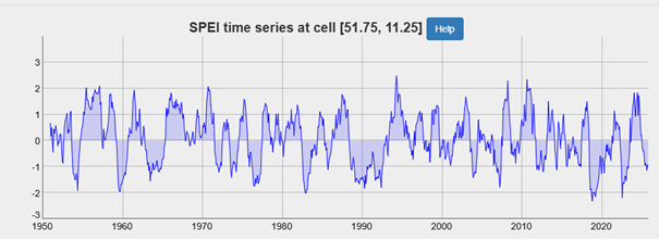 Hat es nicht geregnet ist das nicht der Fall. Daher spielt über Landflächen am Ende doch der Niederschlag die entscheidende Rolle. Temperatur und Niederschlag verarbeitet ein „Bodenindex“ genannt SPEI.