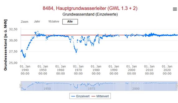 Es zeigt die Höhe des Grundwassers an. Sehen Sie einen Abwärtstrend? Nein? Woher das Gerede über fallende Stände kommt, erschließt sich leider nicht aus wirklichen Daten, nur Prosa wohin man schaut.