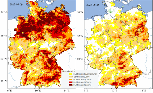 Spätere Monate zeigt der Artikel nicht, denn im Laufe des Monats Juni erfolgte die Umstallung der Methode beim „Dürremonitor“, wir berichteten hier davon und über die Auswirkungen auf die Darstellungen: