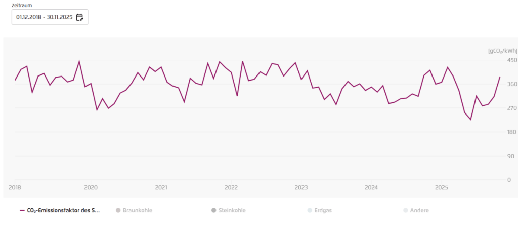 Zwischen Dezember 2018 und November 2025 ist da kein signifikanter Trend im CO2-Emissionsfaktor nach „Agora“. Zwar gab es Erfolge zu Beginn nach 2012, das waren die „Low hanging Fruits“, die mit wenig Aufwand zu ernten waren. Das ist lange vorbei und die Zahlen stagnieren folgerichtig.
