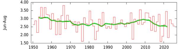Mitnichten ein realer Trend! Die 2,5mm/Tag im Flächenmittel sind völlig unauffällig im Kontext der Sommer bis zurück zu 1950, ebenso wie die maximale Tagesmenge. Eine wirkliche Tendenz ab 1980 (Einsetzen des modernen Klimawandels) ist auch nicht auszumachen, zwischen 2000 und 2010 wurde es etwas feuchter und das Mittel ist nunmehr nach einer Delle bis 2021 etwa da, wo es auch in den 80er Jahren schon lag. Was ist an der Jetstream Story also dran, da das arktische Meereis erst nach 2000 schrumpfte, nach 2011 jedoch nicht weiter?