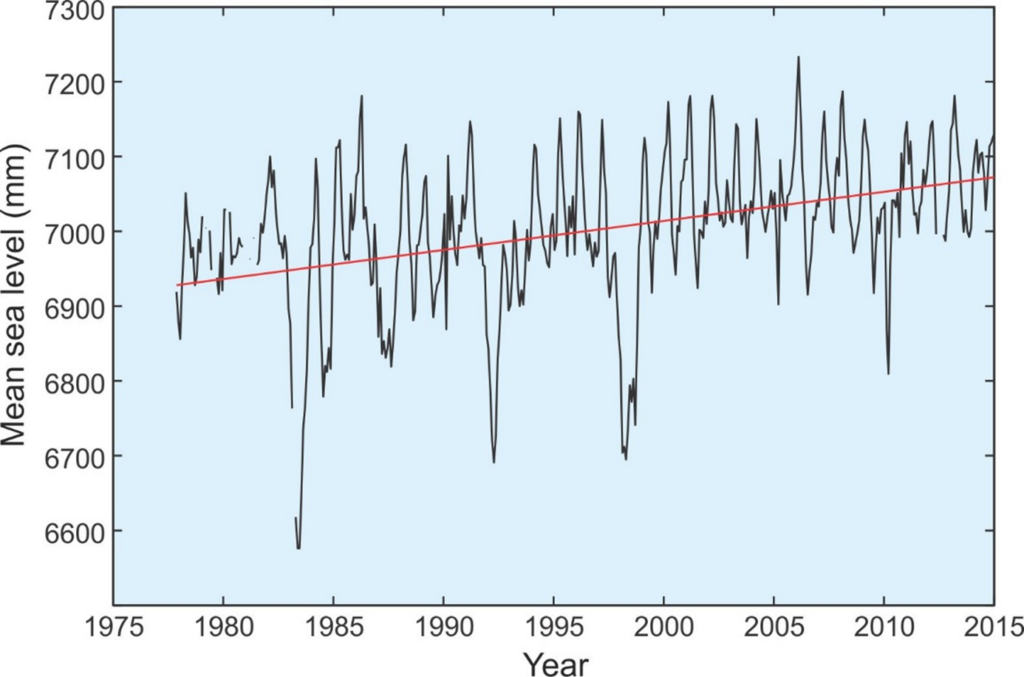 Beginnt man mit dem Jahr 1984, ab dem die Datenqualität besser ist, ist der Anstieg nur etwa halb so hoch, in etwa die 2 mm, die seit 150 Jahren an fast allen Küsten zu finden sind, wo die Städte nicht ins weiche Flusssediment sinken (wie Djakarta), nicht von postglazialer Landhebung oder Plattentektonik betroffen sind.
