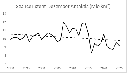 Ähnliches finden wir beim Meereis in der Antarktis. Erst im November 2025 las man dazu auch einen Bericht des Deutschlandfunks. Dort stand: