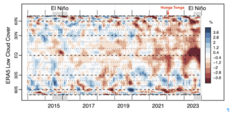 According to Occam’s razor, a climatic event of unparalleled magnitude in modern records requires an exceptional cause. The factors responsible for normal climate variability are insufficient. The only extraordinary factor preceding the 2023 event was the explosion of the Hunga Tonga underwater volcano. The 150 megatons of water vapor that it released into the stratosphere are without precedent in our records.“