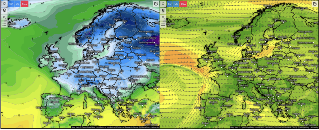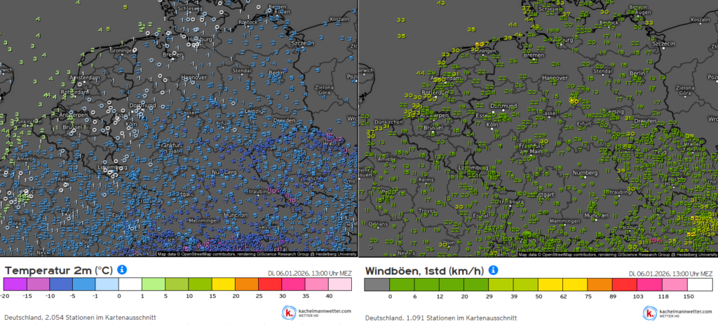 Erinnern Sie sich an den Beitrag vom 27.12.2025? Wir hatten eine kältere erste Januarhälfte 2026 angekündigt als im langjährigen Mittel. Das benutzte Modell (ECMWF mit KI-Unterstützung) lag sehr ordentlich, wie eine Verifizierung zeigt. Am 25.12. sagte es für den 6.1.26 diese Temperaturen (links) und Wind (rechts) voraus: