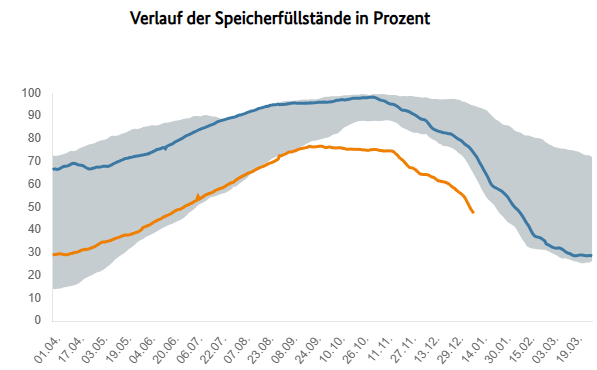 Was sehen wir? Wieder Dauerfrost, wenig Wind aus östlichen Richtungen! Der Atlantik soll wieder „blockiert“ sein und der Winter schlägt zurück. Für die Energieversorgung brechen also recht wahrscheinlich wieder „lausige“ Zeiten an. Besonders der Gasspeicherstand muss besorgen. Ein Blick auf die Zahlen bis 10.1.26: