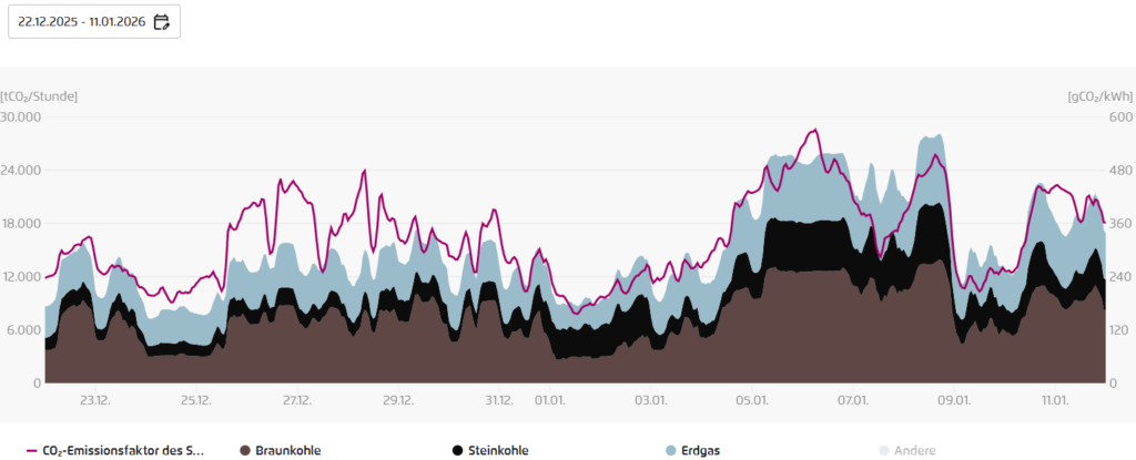 In weiten Teilen des Landes herrschte Dauerfrost, im Binnenland wurden nur vereinzelte Windböen über 25 km/h gemessen. Entsprechend hoch war der CO2-Ausstoß der Energieproduktion, bis zu 572 g CO2/kWh. Solar ist im Winter praktisch nicht beteiligt und Windkraft, welch Überraschung, hängt sehr vom Wind ab. Vom 1. bis zum 12.Januar wurde denn auch nur ein Temperaturmittel für Deutschland gefunden, das um 2,1 °C UNTER dem Mittel 1961-1990 lag (Quelle).