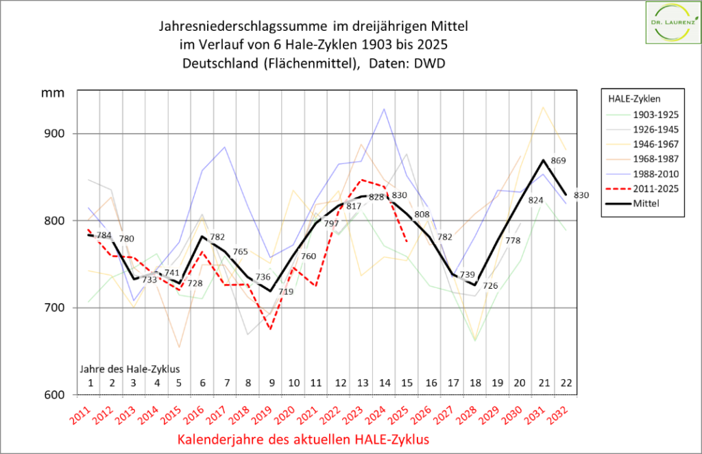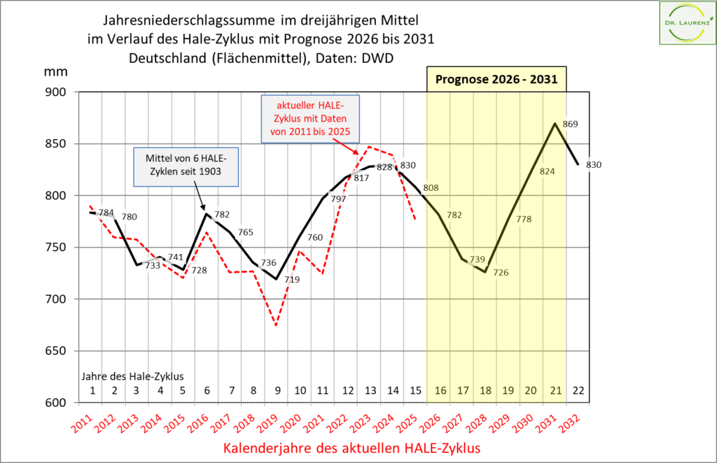 Das Mittel aus den 6 Hale-Zyklen bildet die schwarze Prognoselinie. Der Prognosezeitraum der nächsten 6 Jahre ist gelb hinterlegt. Demnach kann für 2026 mit 782 mm ein mittleres Niederschlagsniveau (im Mittel von 3 Jahren) prognostiziert werden. Bis 2028 sinkt das prognostizierte Niederschlagsniveau mit 726 mm auf ein Minimum. Danach ist ab 2029 ein linearer Anstieg auf 869 mm in 2031, mit dem Maximalwert des gesamte Hale-Zyklus, zu erwarten.