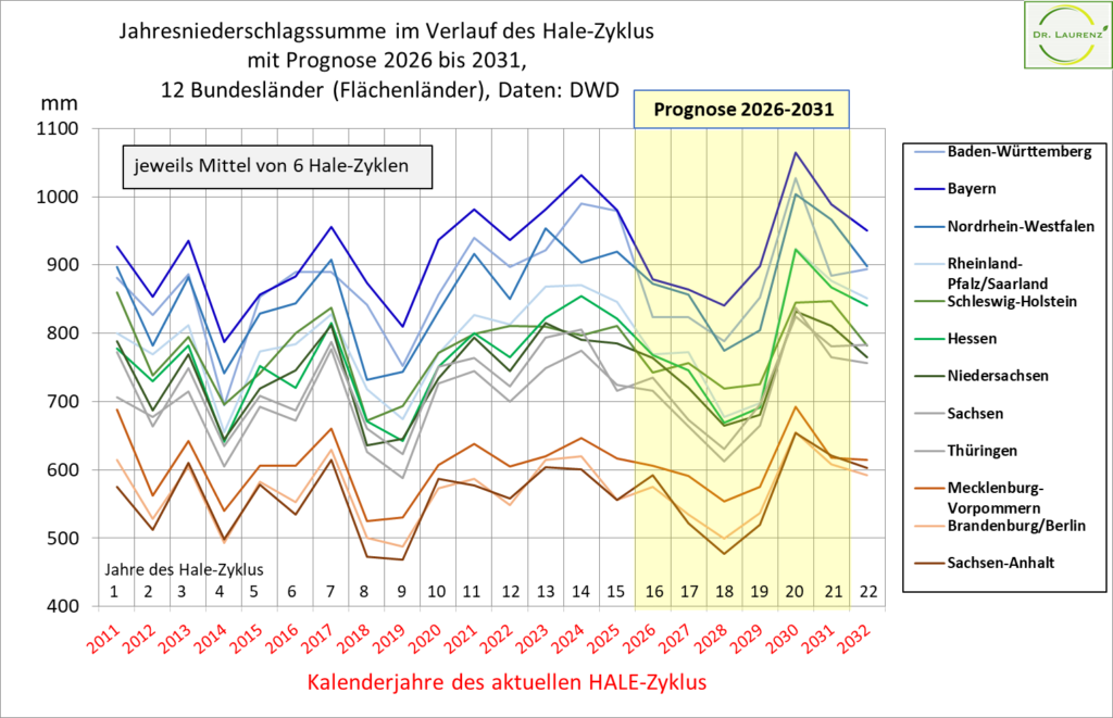 Abb. 3: Niederschlagssumme (der Einzeljahre) im Verlauf des Hale-Zyklus – als Mittel von 6 Hale-Zyklen im Flächenmittel von 12 Bundesländern; jede der 12 Kurven gilt als Prognoselinie für das jeweiligen Bundesland und kennzeichnet den jeweiligen Prognosewert für die einzelnen Zyklusjahre. Die Prognosephase 2026 bis 2032 ist gelb hinterlegt.