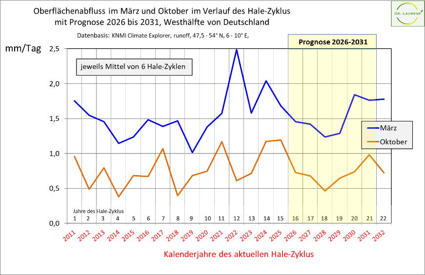 Abb. 5: Oberflächenabfluss (runoff) im März und Oktober in der Westhälfte von Deutschland im Mittel von 6 Hale-Zyklen. Die beiden Linien kennzeichnen die Prognosewerte für die einzelnen Zyklusjahre. Die Prognosephase 2026 bis 2031 ist gelb hinterlegt.