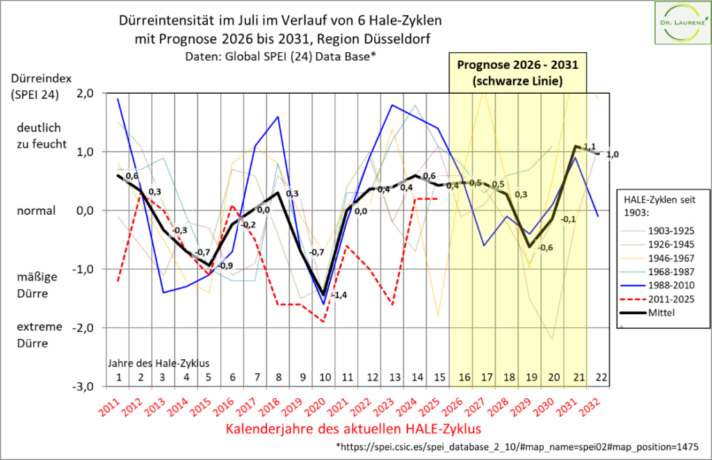 Abb. 6: Dürreintensität im Juli im Verlauf von 6 Hale-Zyklen in der Region Düsseldorf, mit Hervorhebung des vorletzten (blau) und aktuellen Zyklus (rot gestrichelt);                                      die schwarze Mittelwertlinie kennzeichnet die Prognosewerte für die einzelnen Zyklusjahre. Die Prognosephase 2026 bis 2031 ist gelb hinterlegt,