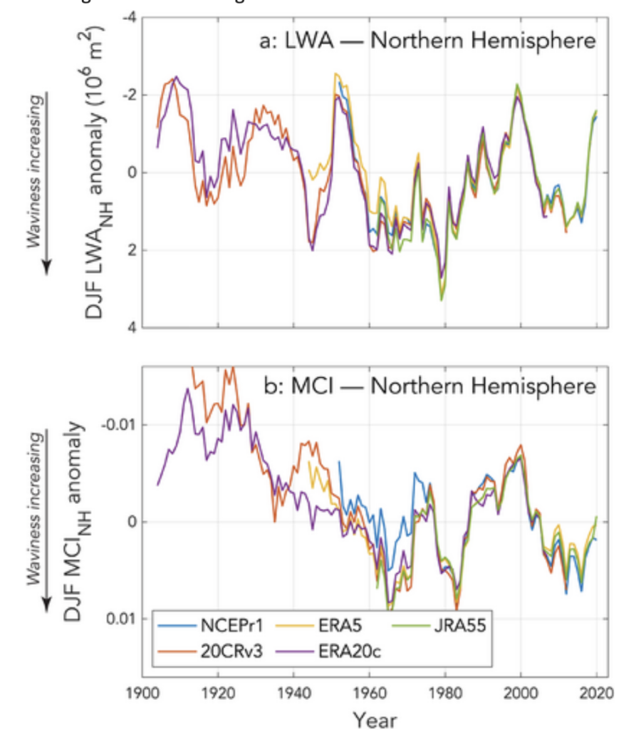 „We show that five reanalyses and three independent waviness metrics all indicate that these recent increases in Northern Hemisphere mid-latitude jet stream waviness are well within 20th century variability, and periods of higher waviness occurred in the 1960s–1980s, prior to the emergence of Arctic amplification.”
