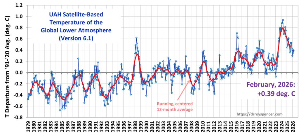 Die globale Temperatur hat sich im Februar 2026 leicht erhöht. Sie liegt nun um 0,39 Grad Celsius höher als das langjährige Mittel. Der Abkühlungstrend seit 2024 ist noch ungebrochen.