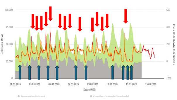 Abbildung: Stromerzeugung und Strompreis im März 2026. Die linke y-Achse gilt für die Leistung: Erneuerbar (grün), Kohle und Gas (grau). Die rechte y-Achse gilt für die rote Strompreiskurve. Rote Pfeile : hohe Strompreise, blaue Pfeile: Strompreis nahe Null.