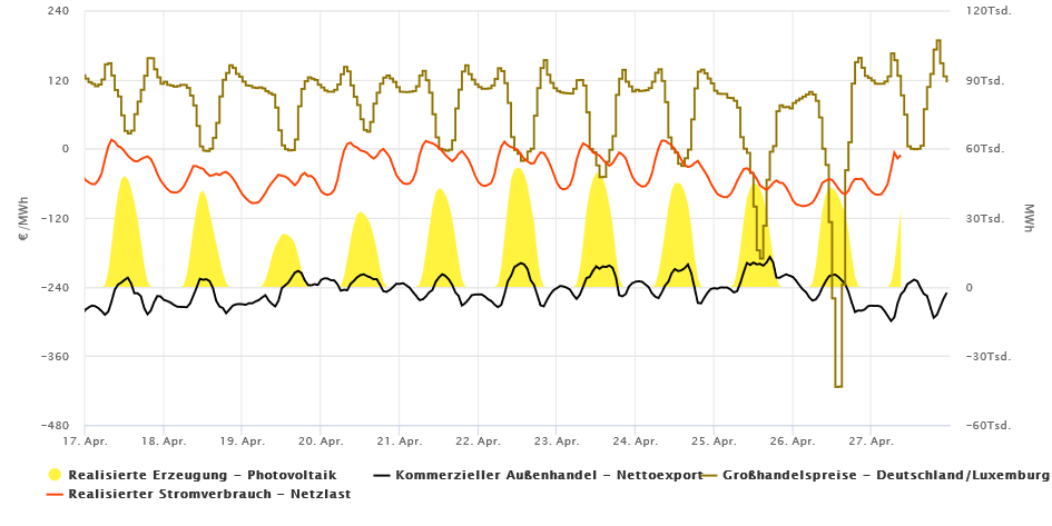 Am Sonntag 26.04.2026 wurde ein neuer Niedrig-Großhandelspreis-Rekord an der Börse erzielt. Dank Photovoltaik (PV) wurde in der Stunde von 14:00 bis 15:00 zu -41,3 ct/kWh (Minus!) gehandelt. Die PV Produktion betrug 39203 MWh bei einer Netzlast von 42555 MWh. Über die Dauer von 10:00 bis 17:00 waren die Preise negativ. Auch an den Vortagen gab es negative Preise. In der nachfolgenden Grafik ist der Zusammenhang zwischen PV und negativen oder nahe Null Börsenpreisen eindeutig erkennbar.
